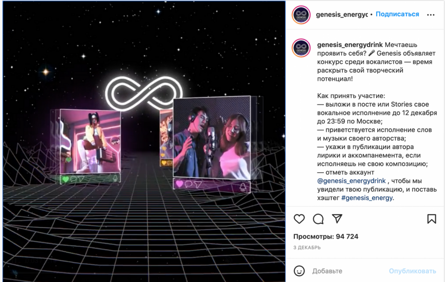 На первом этапе право на участие было у каждого. Поэтому на втором этапе неограниченное число пользователей создавали музыкальный контент и размещали его в постах и сторис Instagram с хештегом #genesis_energy.