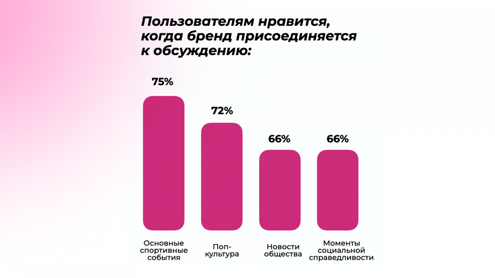 Пользователи также считают уместным, когда бренд присоединяется к обсуждению «громких» тем, например, новостям общества, поп-культуре, спортивным событиям. Игра на инфоповодах действительно обладает большим виральным потенциалом. Но здесь очень важно, чтобы тема была релевантна и отвечала ценностям самого бренда. Иначе такую рекламу сочтут манипуляцией для сбора лайков и в лучшем случае проигнорируют.