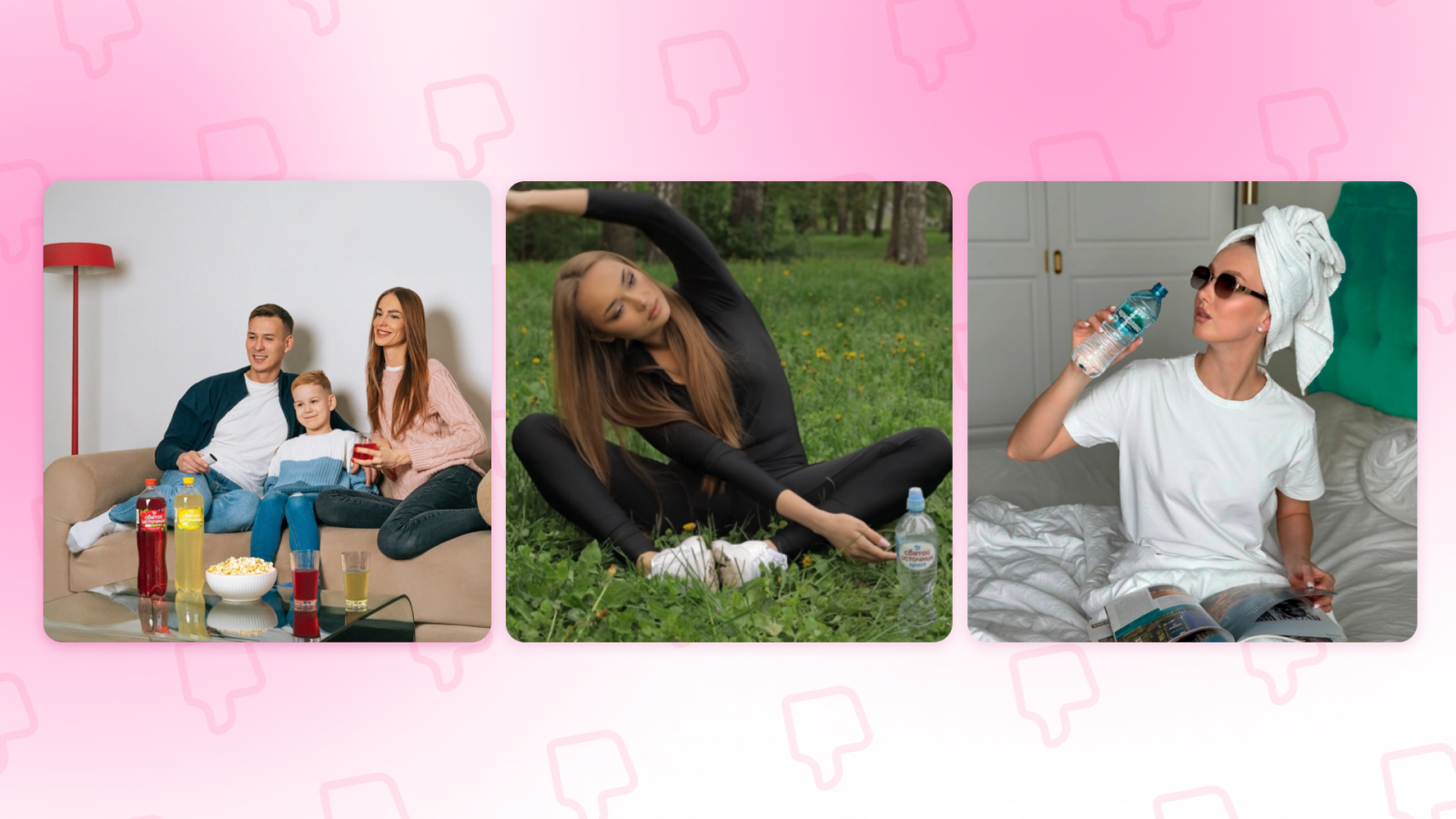 На фоне «одинаковости» всех брендов, что особенно заметно в высококонкурентной FMCG категории, такие изображения выглядят однообразными и скучными. Но самое главное — не искренними! Люди видят фейки и не верят им. У нас три ситуации потребления и все про бренд и продукт, а не про реального человека: идеальная семья в выглаженной одежде, неудобных джинсах у абсолютно стерильного стола, девушка, занимающаяся йогой в кроссовках без коврика, которая делает глотки чаще, чем меняет позы и абсолютно нереалистичная ситуация потребления с девушкой при полном мейкапе, в очках, полотенце и с журналом, «невзначай» утоляющей жажду так, чтобы лого на бутылке при этом хорошо просматривалось.