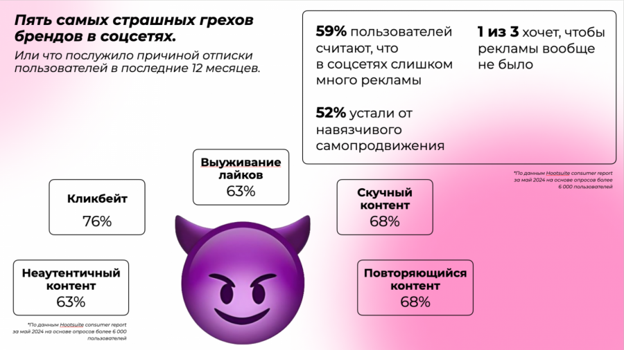 SMM-маркетинг сейчас переживает смысловой кризис и путь к выходу из него — по-настоящему искренняя и осознанная коммуникация, основанная на потребностях аудитории. Пользователи соцсетей устали от навязчивой рекламы. Основные причины отписок: