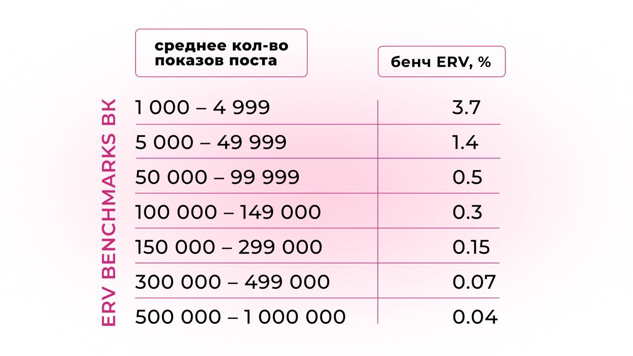 Как видите, сравнивать показатели вовлечённости с конкурентами довольно сложно. Даже если вы найдете сообщества из вашей ниши с похожей стратегией, целевой аудиторией и соразмерным количеством показов, то их % ERV не может быть однозначным ориентиром.