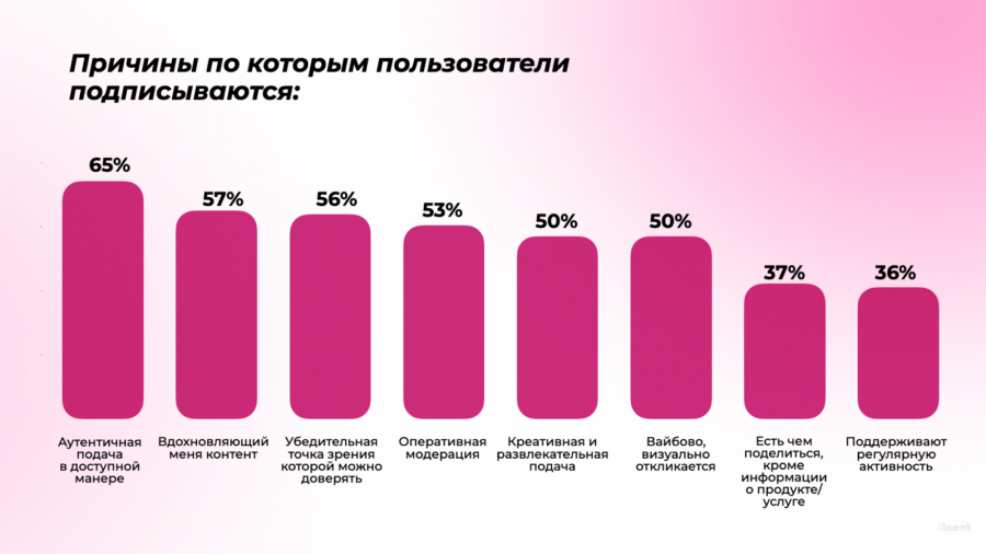 Ещё одна важная тема, которую хочется затронуть — почему пользователи подписываются и отписываются от брендов и что ждут от контента. По данным исследования Hootsuite за май 2024, более 70% пользователей, подписанных на бренд выражают намерение приобрести его продукцию в скором времени, а 59% — уже являются покупателями.
