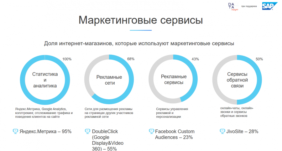 В исследовании рассмотрены 54 интернет-аптеки, что соответствует нижнему порогу в 50 заказов в день. Данные по аффилированным интернет-магазинам не суммируются. Исключение делается только для сайтов одного бренда (например,apteka-ifk.ruи aptekaifk.ru) или сайтов брендов-«клонов». Для определения сервисов, используемых интернет-магазинами, анализировались данные автоматического мониторинга с дополнительной ручной проверкой.