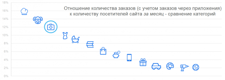 В секторе интернет-аптек конверсия составила 12,1%. Ближайшие показатели у зоомагазинов и интернет-магазинов одежды и обуви.