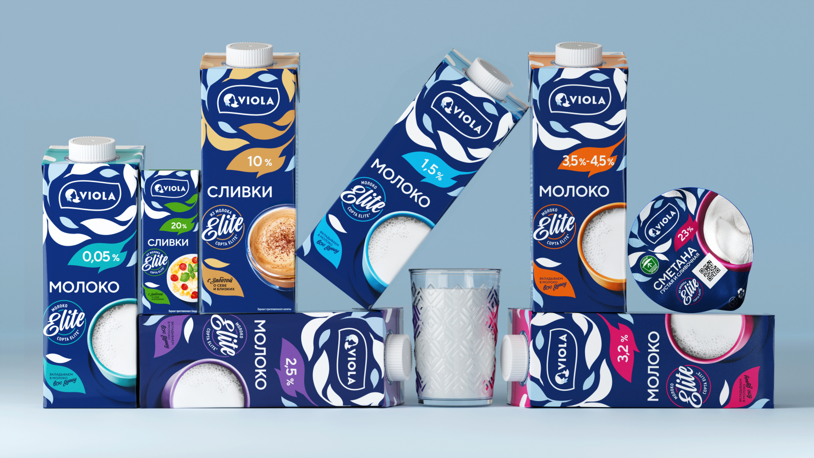 Бренд стал легко узнаваем по графическим элементам в виде листьев, стилистически перекликающихся с шейпом логотипа. Вместе они образуют единое целое и передают идею легкости и натуральной природности молочных продуктов Viola. Клейм Elite теперь доносит суть качества молока.