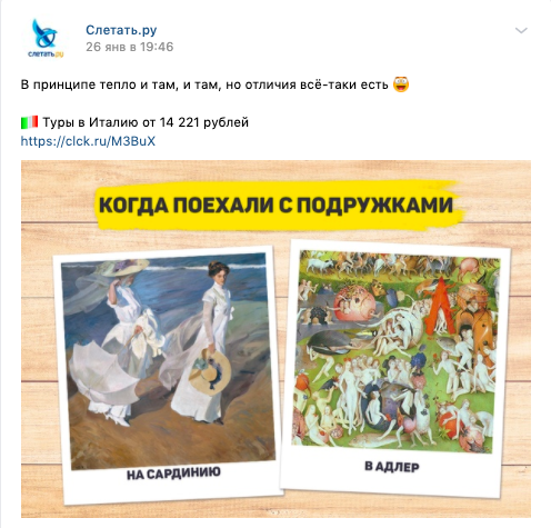 Понимая настроения аудитории, мы предложили внедрить ироничный подход к контенту и разбавить его мемами про отпуск, сохранив подборки бюджетных туров. В Instagram мы сделали упор на любовь нашей аудитории к контенту от блогеров и запустили цикл заметок.