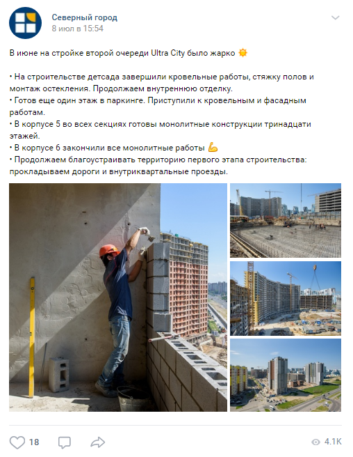 При подготовке SMM-стратегии для крупного петербургского застройщика «Северный город» мы выявили три сегмента аудитории: дольщики, жильцы и покупатели. У каждого сегмента свои триггеры и интересы, а задача сообществ «Северный город» — доносить миссию бренда для каждого через релевантный контент. В рамках нового подхода мы не только стали создавать контент специально под конкретный сегмент, но и начали его узконаправленно продвигать.