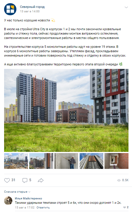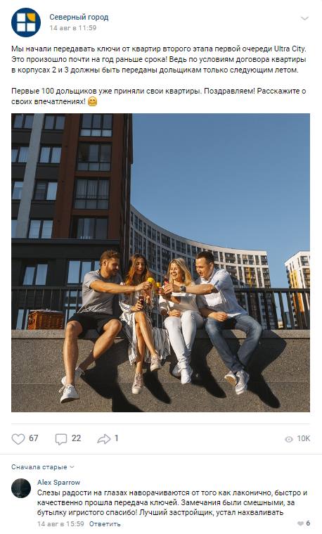 Например, очевидно, что тема «Ход строительства ЖК» будет больше волновать дольщиков, которые с нетерпением ждут передачи ключей, а джазовый концерт на территории ЖК заинтересует непосредственных жителей комплекса. Таким образом мы повышаем лояльность пользователей к бренду: они видят только интересную и полезную для себя информацию. Социальные сети становится для них проводником и помощником в коммуникации друг с другом и компанией.
