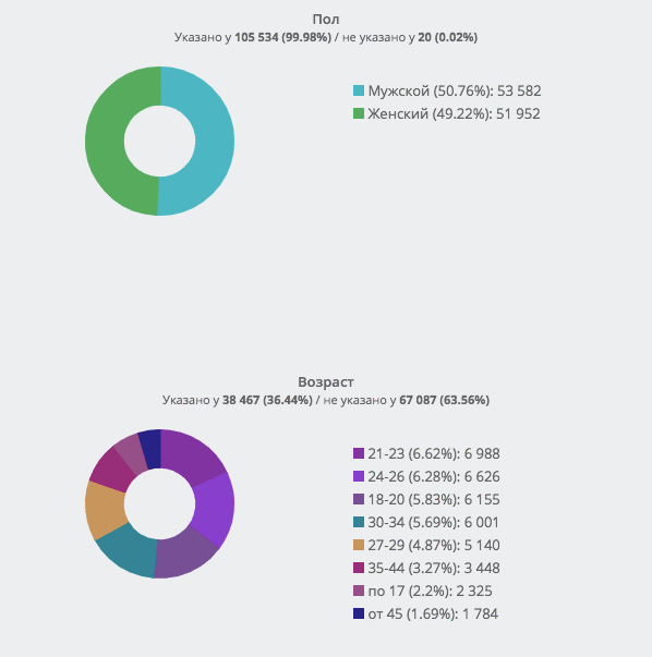 Как мы видим, аудитория практически поровну разделилась между мужчинами и женщинами, а самый многочисленный сегмент — это пользователи от 18 до 34 лет.