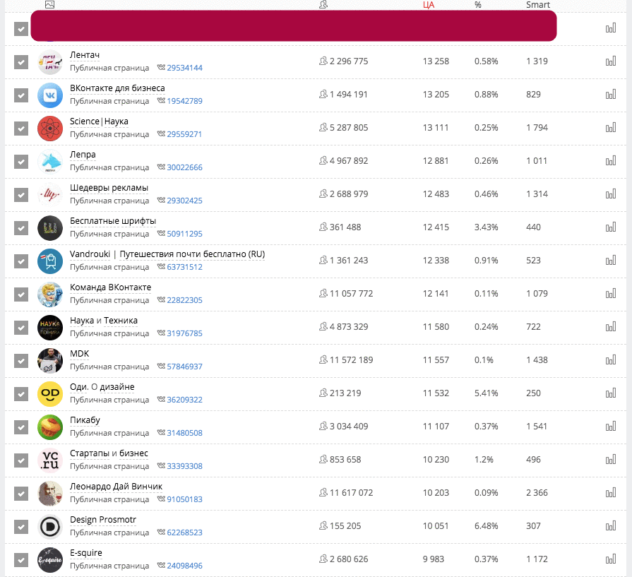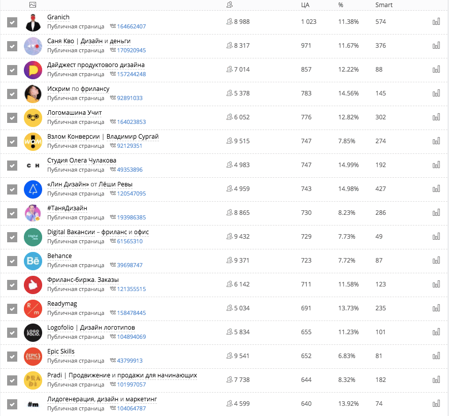 Далее — паблики поменьше. Смотрите, какая шикарная выборка.