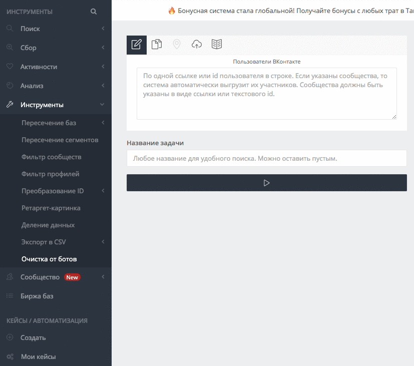 Теперь переходим к инструменту «Очистка от ботов». Здесь придется запастись терпением, так как процесс может занять и час: зависит от численности вашей аудитории.