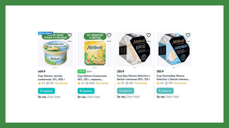 Мы определили основную цель кампании — увеличить продажи линейки сыров Natura на сервисе Ozon Fresh, предназначенном для быстрой доставки продуктов питания, бакалеи, бытовой техники, электроники и товаров других категорий.