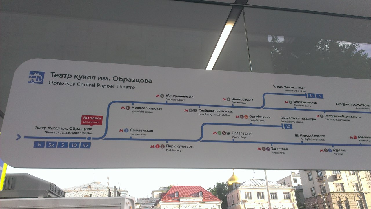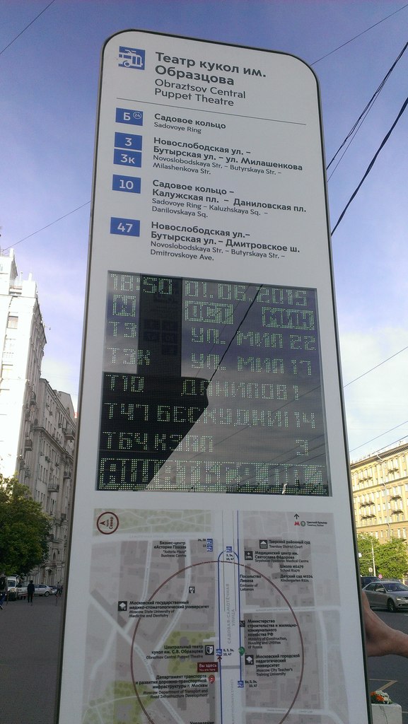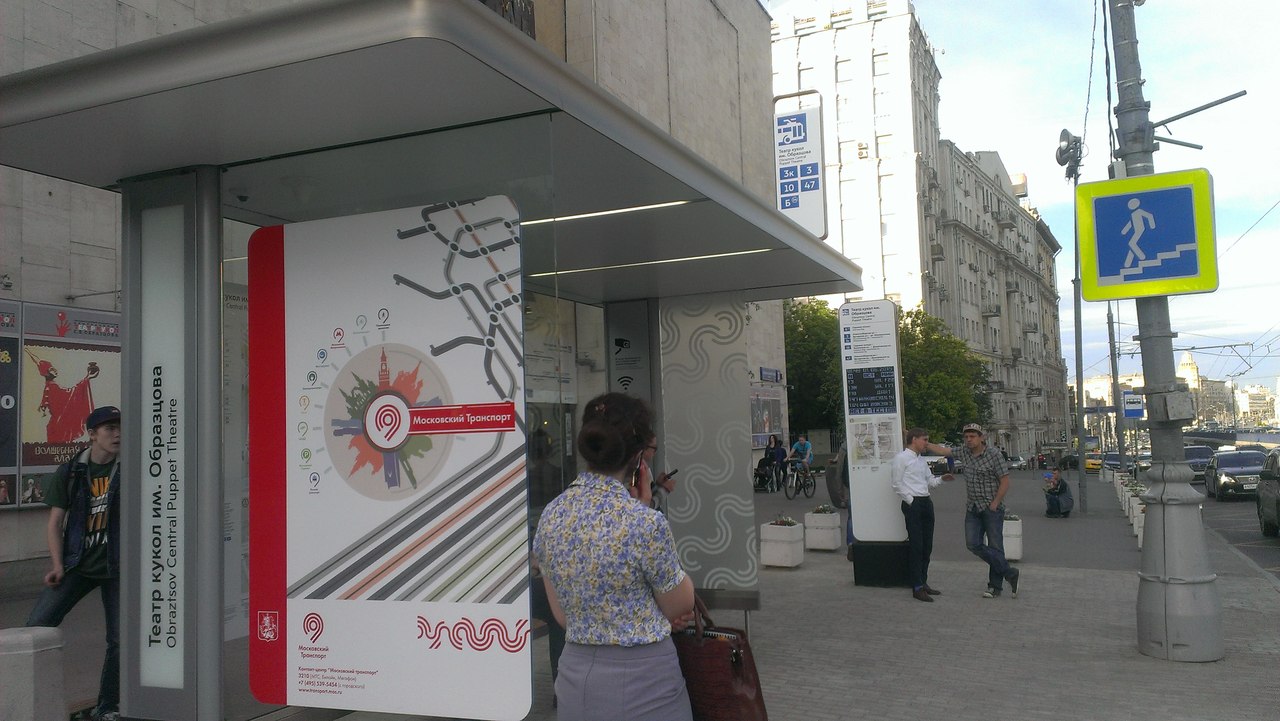 Новая визуальная система активно внедряется во все элементы транспортной инфраструктуры города, начиная с новых станций метрополитена и заканчивая высокотехнологичными остановками наземного транспорта. Первая новая остановка появилась на Садовом кольце около театра кукол имени Образцова.