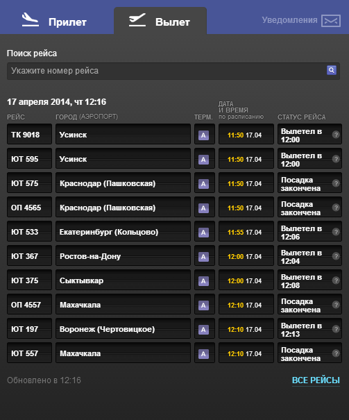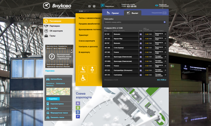 Одним из самых сложных элементов на сайте Внуково является онлайн-табло. Каждые 30 секунд сайт синхронизируется с внешней базой, обновляя информацию о более чем двух тысячах рейсах. И даже если вы не обновляете страницу, система всегда будет отображать только актуальные данные, благодаря технологии ajaх. Статусы рейсов окрашиваются определенным цветом для удобства просмотра (зеленый – для посадки и регистрации, желтый для задержанных рейсов и т.д).