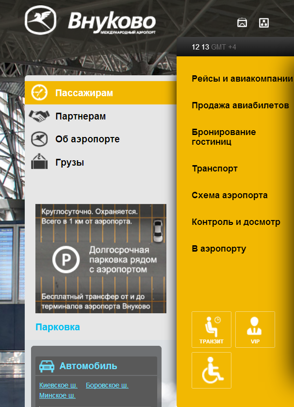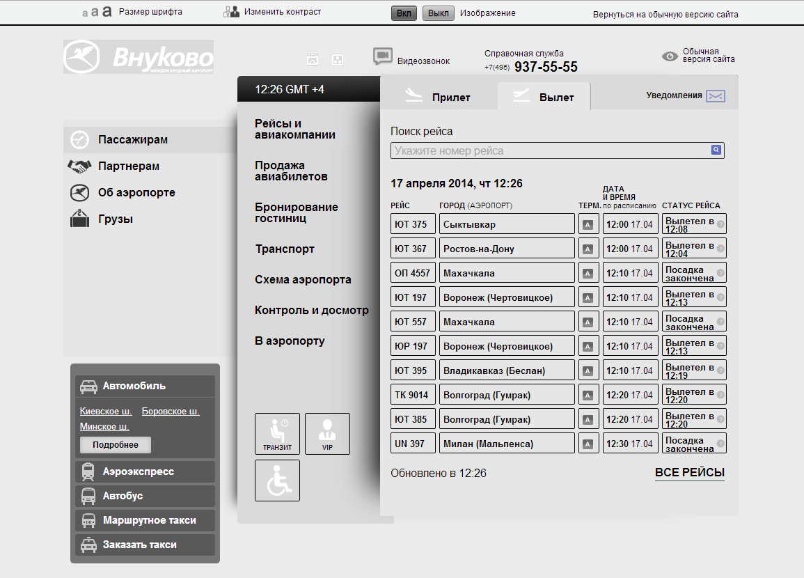 Для пассажиров с ограниченными возможностями – специальная контрастная версия сайта с возможностью регулировки размера шрифта, а также информация о специальных услугах в аэропорту. Версия для слабовидящих находится по отдельному адресу для быстрого доступа именно к ней из закладок браузера.