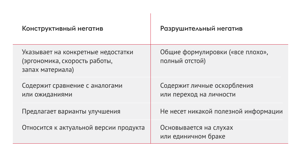 Разрушительный негатив — это всегда про эмоции без фактов или про намеренное очернение. Такой контент бренду не нужен, и договариваться о его появлении бессмысленно. Но именно конструктивная критика становится тем самым «золотом», которое повышает доверие.