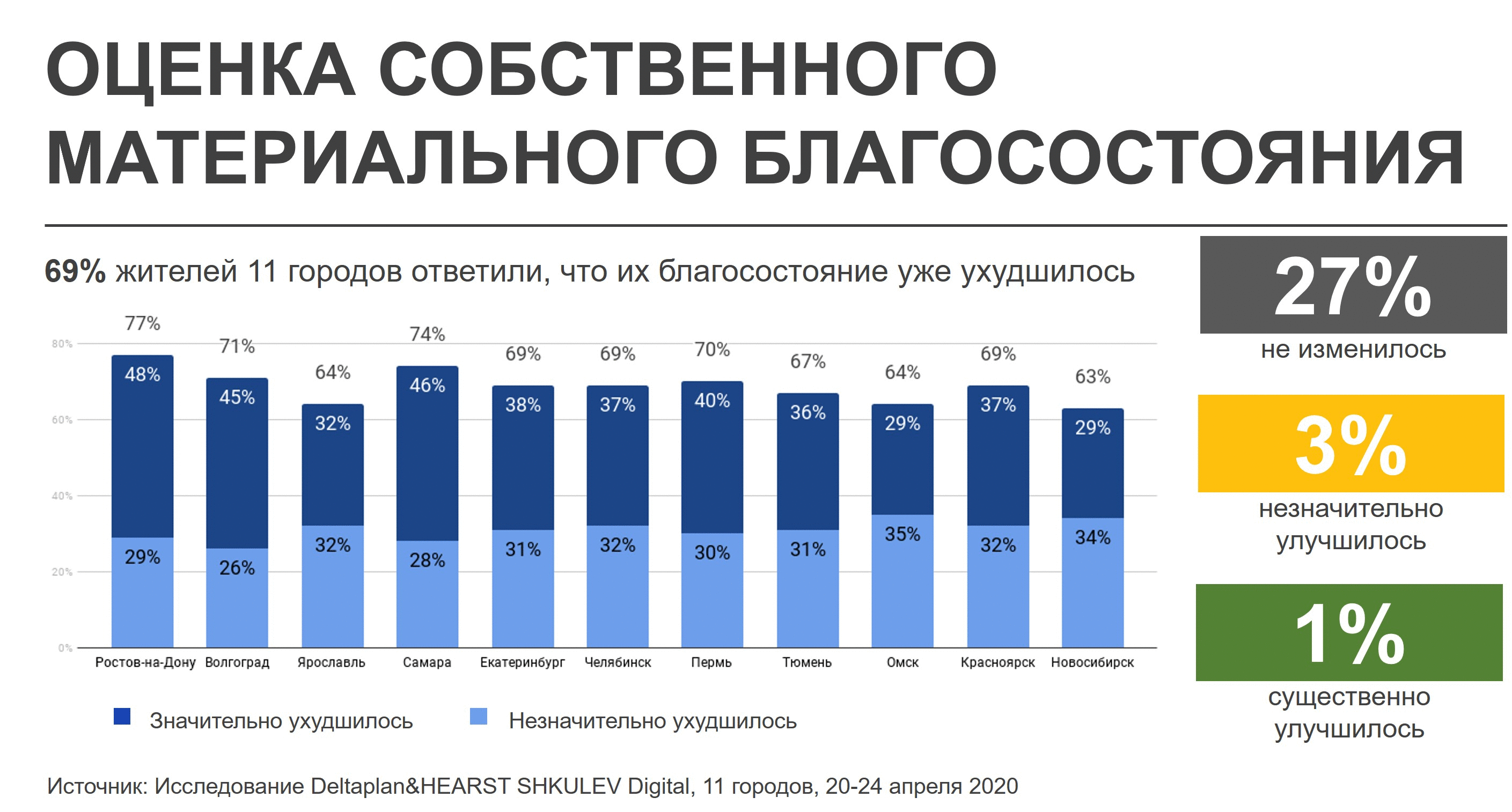 Значение индекса было рассчитано исходя их двух групп факторов. Первая группа — оценка горожанами своего текущего и будущего благосостояния. На конец апреля в среднем 69% опрошенных горожан заявили, что их материальное положение уже ухудшилось. Самыми пострадавшими чувствуют себя жители Ростова-на-Дону (77%) и Самары (74%). Меньше всего ощутили последствия пандемии на текущий момент жители Новосибирска (63%), Омска и Ярославля (по 64% соответственно). При этом 4% горожан сообщили, что их благосостояние улучшилось за последний месяц. 27% ответили, что их материальное положение никак не изменилось.