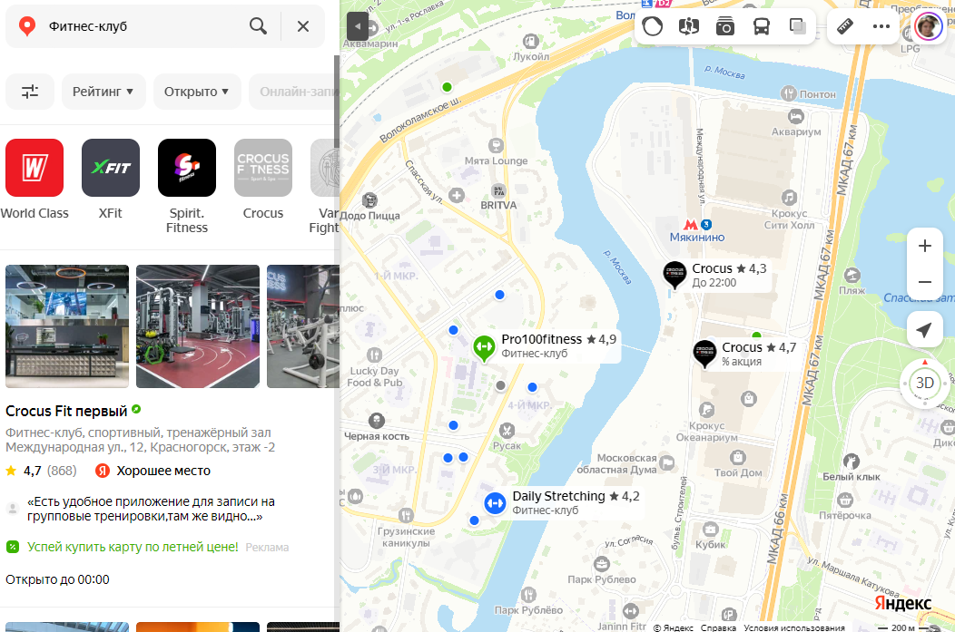 «Яндекс.Карты» позволяют разместить организацию бесплатно, но мы умышленно выбрали платный брендированный вариант, ведь конкуренция в нише в Москве невероятно высокая. Зачастую в одном районе находятся сразу несколько фитнес-клубов. Требовалось чётко выделиться на фоне конкурентов.