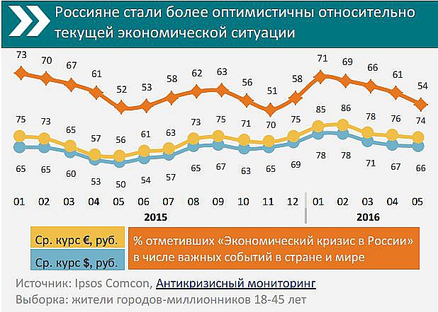 Экономический кризис волнует 54% опрошенных, что на 7 п.п. меньше, чем в апреле. Люди стали более оптимистичны в отношении текущей экономической ситуации на волне патриотических настроений. С другой стороны, россияне продолжают экономить на всех категориях продуктов.