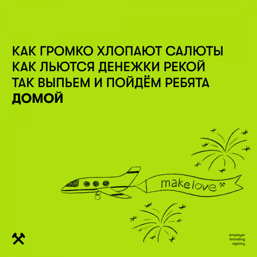 Команда makelove желает вам головокружительных охватов, неиссякаемых бюджетов, чтобы СМИ дрались за ваши статьи, а звёзды занимали очередь на ивенты.