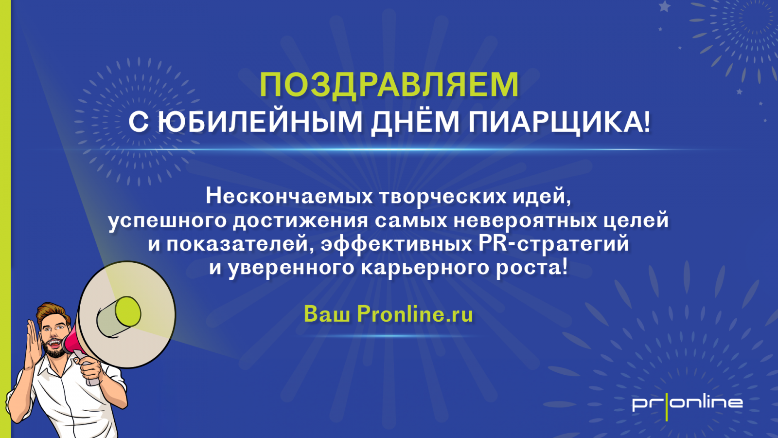 В честь праздника мы хотим пожелать вам нескончаемых творческих идей, успешного достижения самых невероятных целей, эффективных стратегий и уверенного карьерного роста! Давайте вместе продолжим с каждым днем делать российский PR еще более сильным и результативным!