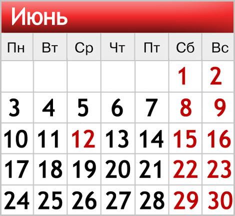 Таким образом, рабочими являются понедельник, вторник, четверг и пятница. Предпраздничный день, 11 июня, является сокращенным на один час.