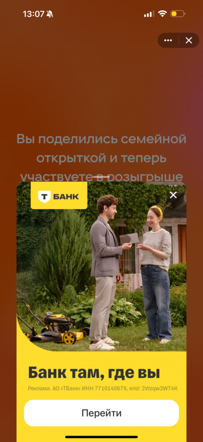 «Т-Банк» искал охватные медийные форматы, способные поддержать глобальную рекламную кампанию «Т-Банк там, где вы». Одноклассники стали подходящим выбором: сервис позволил охватить большую аудиторию с фокусом на пользователей 40+ лет, а ко Дню семьи команда платформы запустила интерактивное приложение для создания открыток. Оно объединило близких на общем фотоколлаже с использованием тематических фонов.