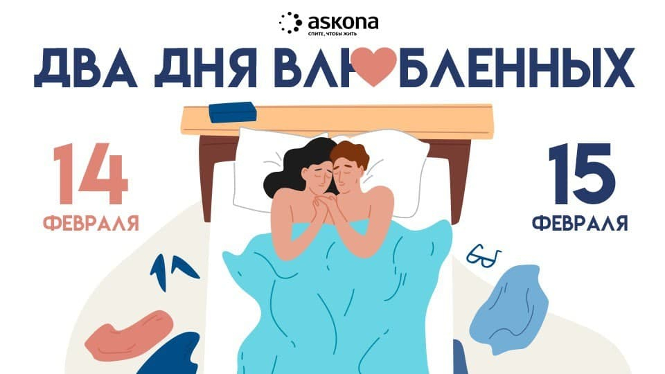 Что делать 14 февраля? Любить, утомляться, спать и снова любить! Но когда же отдыхать? Конечно, 15 февраля! Любить, вдохновляться, отдыхать и продолжать любить. В рамках спецпроекта «Два дня влюбленных» креаторы распределили продукцию от Askona c точки зрения ее актуальности 14-го и 15-го февраля, и предложили пользователям дарить ее в самый подходящий момент.