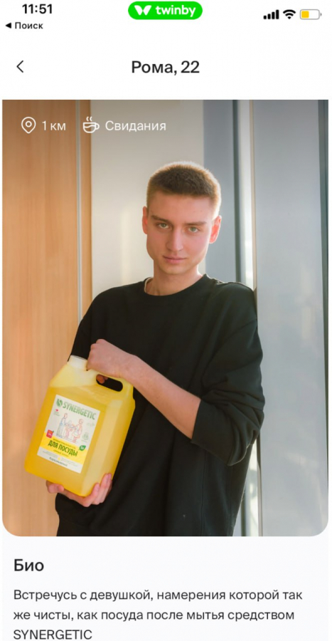 Бренд предложил креативный способ поддержать сотрудников без пары к 14 февраля. Для всех желающих Synergetic предоставил премиум-аккаунты в набирающем популярность приложении для знакомств Twinby, а перед этим организовали фотосессию, чтобы сделать фото профиля. Для неё каждый сотрудник выбрал любимое средство бренда, а после придумал креативную подпись — чтобы до того, как разделить настоящую любовь, разделить любовь к средствам Synergetic.