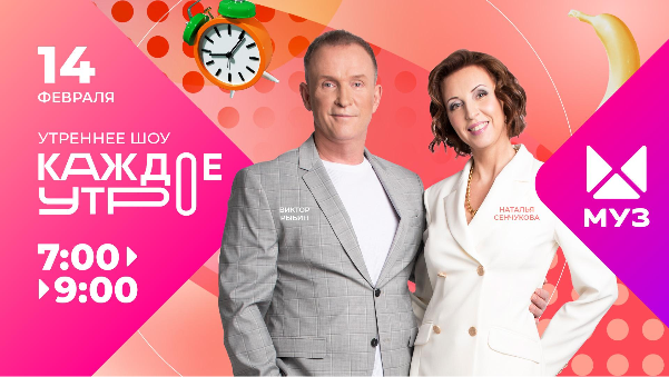 «Влюблённое» утро на МУЗ-ТВ начнётся со специального эфира шоу «Каждое утро» с Андреем Джелиевым и Юлией Плаксиной. Ведущие проведут это утро с семейным дуэтом, одной из самых красивых и крепких звёздных пар — певцом и композитором Виктором Рыбиным и его супругой — певицей Натальей Сенчуковой.