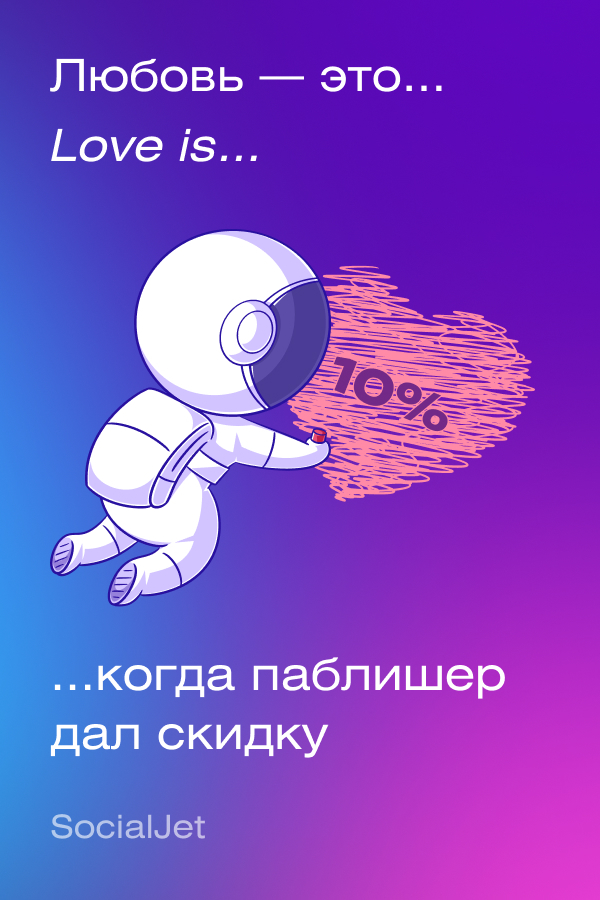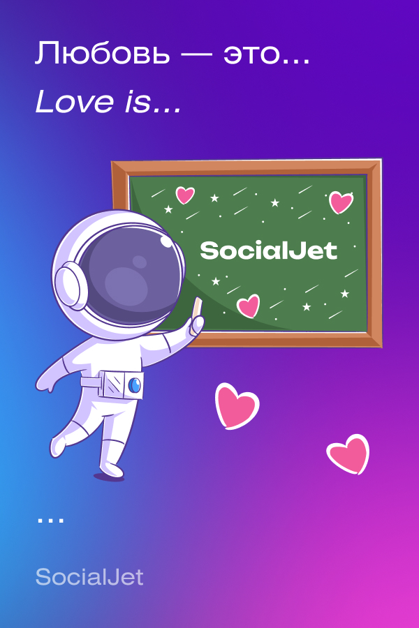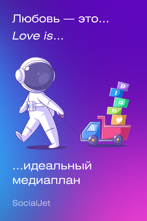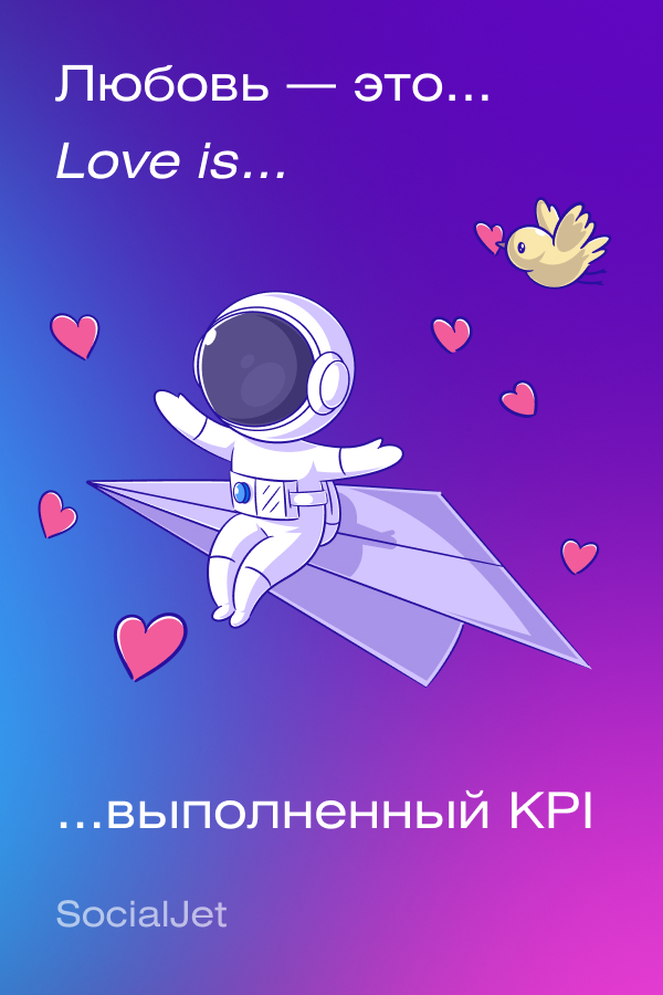 SocialJet к празднику любви подготовила набор из валентинок. Из них вы узнаете, что любовь бывает не только романтической, но и космической. В компании напомнили, что иногда любовь — это «выполненный KPI» или «идеальный медиаплан».