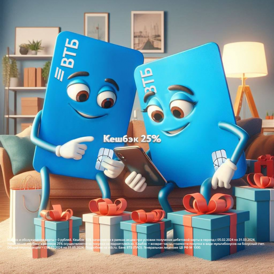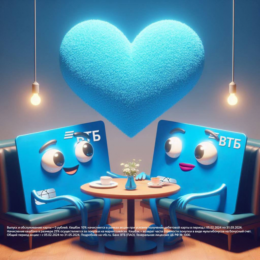Вот так нейросеть видит дебетовые карточки ВТБ, которые счастливо наслаждаются 14 февраля. Почему они такие счастливые? Они купили друг другу подарки на популярных маркетплейсах и получили 25% кешбэк. А эту милую коллаборацию сделали совместно с художником по искусственному интеллекту Jimmy Neiron.