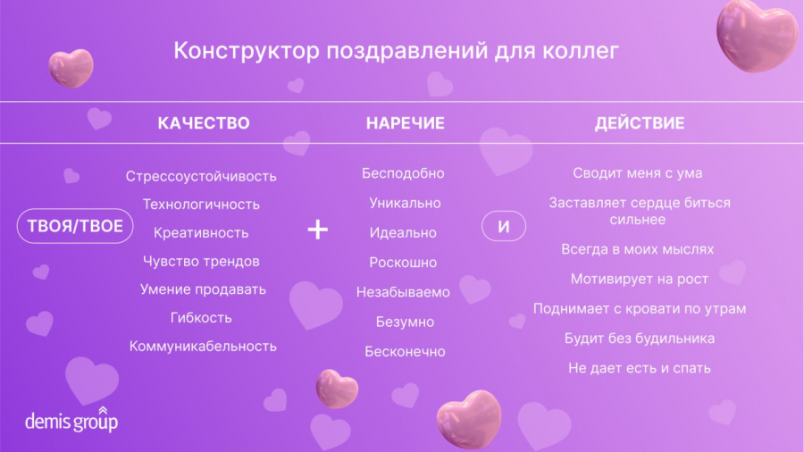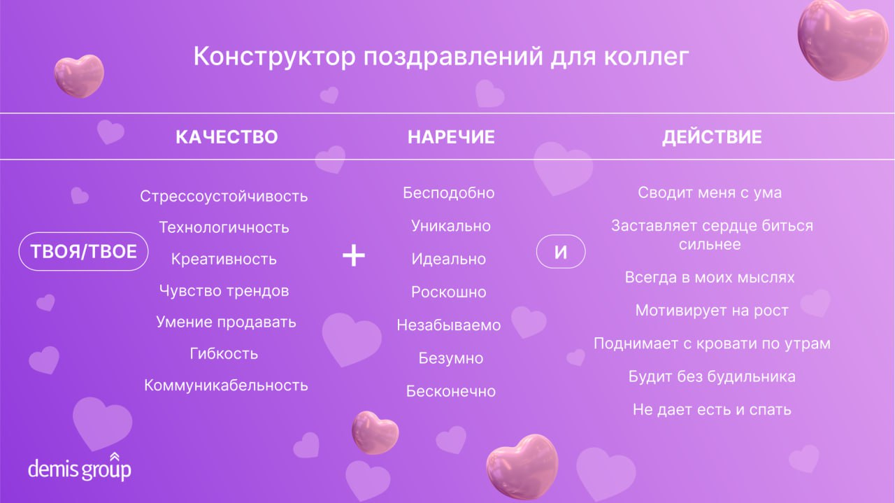 Не знаете, как признаться в профессиональной любви? Demis Group делает эту задачу простой и увлекательной. Просто выберите качество, украсьте наречием и добавьте действие. Остается только поделиться комплиментами с любимыми коллегами.