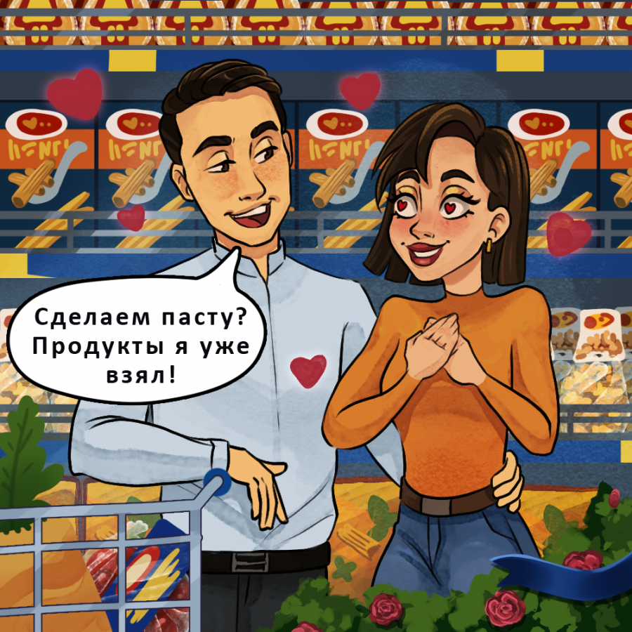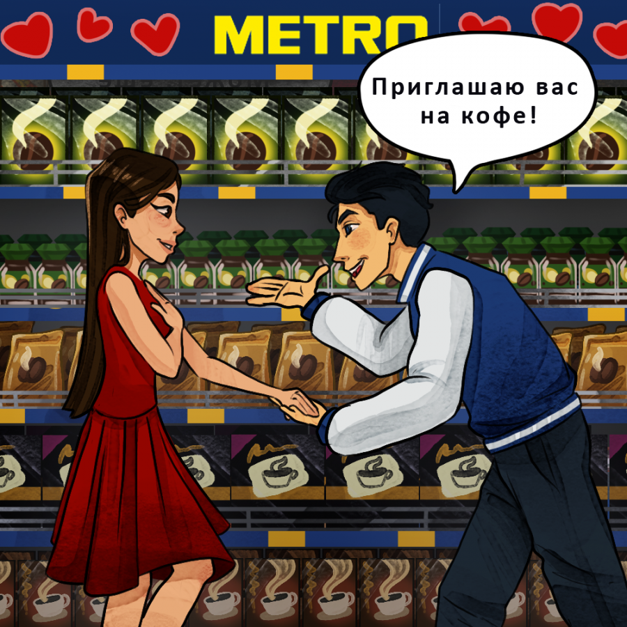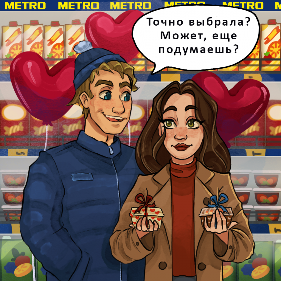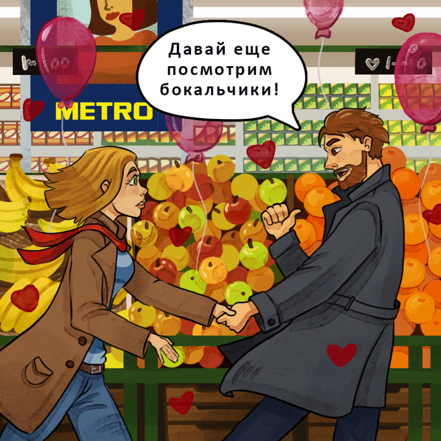 Огромный ассортимент продуктов METRO, щепотка зарисовок из жизни и немножко фантазии иллюстратора — все, что понадобилось команде, чтобы воплотить мечты о парном шоппинге в реальность. В романтичном комиксе никто не торопится сделать выбор, а совершает настоящие поступки для своей второй половинки. Думаете, это фантастика? Совсем нет. Попробуйте действовать, как герои этих сюжетов, и идиллия в праздник вам обеспечена.