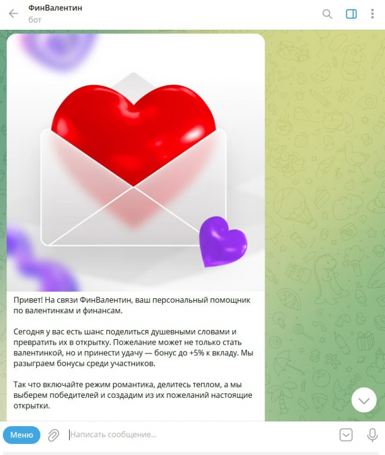 Nectarin в преддверии Дня святого Валентина запустили чат-бот ФинВалентин. Чтобы финансы росли вместе с вашими чувствами нужно было отправить свое признание в любви до 13 февраля. Эти трогательные послания превратились в милые валентинки, которыми можно было поделиться с близкими. А повышенный процент по вкладу стал приятным бонусом для авторов открыток.