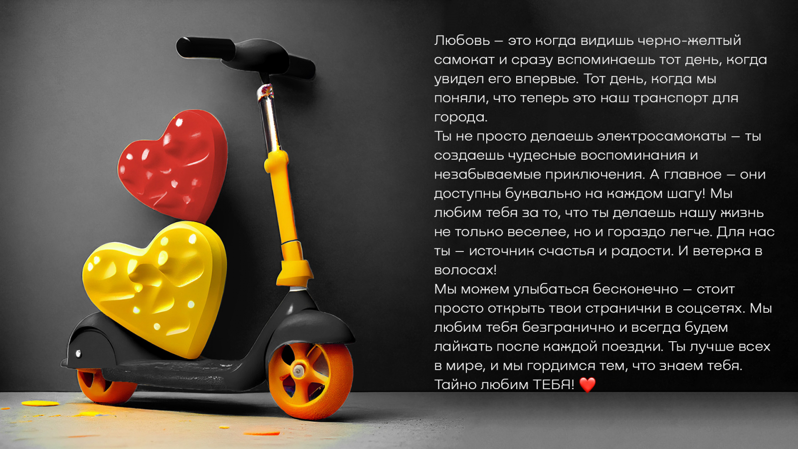 На улицах Москвы и Питера появились автомобили-валентинки. Надписи «Открой не только дверь машины, но и своё сердце», «Давай всегда кататься вместе» и «Всегда буду рядом» появились на крышах некоторых автомобилей. Такие презенты «Ситидрайв» отправил коллегам по цеху BelkaCar, «Делимобилю» и «Яндексу».