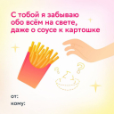 Out Digital представили телеграм-бота с виртуальными открытками. Картинку можно выбрать из предложенных ботом или довериться рандомайзеру. Остаётся только вписать имена отправителя и получателя и скинуть её близкому человеку. Больше всего проект понравится тем, кто любит друг друга так же сильно, как еду или доставку продуктов. После использования бота пользователь получает промокод со скидкой на первый заказ в «СберМаркете».