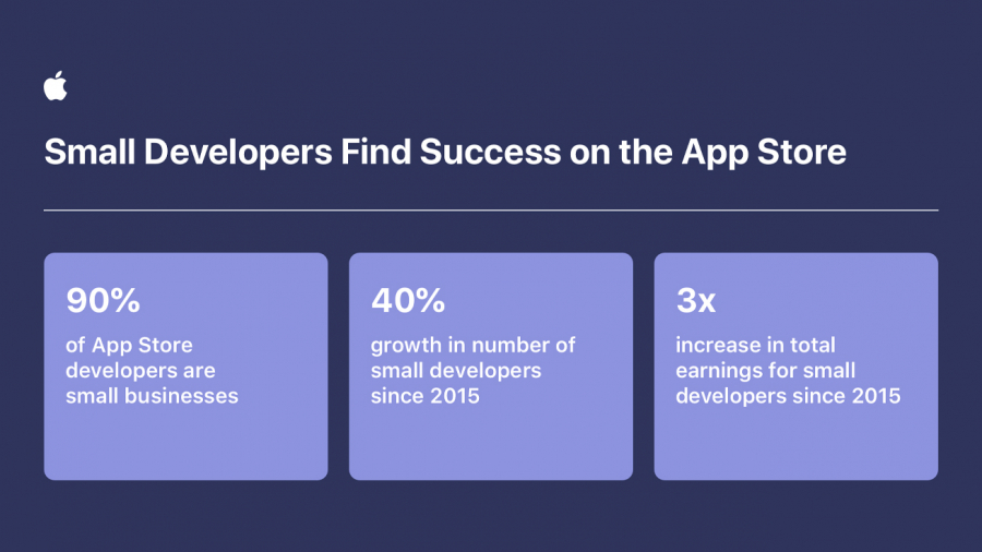 Количество малых разработчиков во всем мире выросло на 40% с 2015 года и составило более 90% от общего числа разработчиков в App Store. В целях исследования малыми считались разработчики, имеющие менее 1 млн скачиваний и менее $1 млн прибыли от всех своих приложений в год.