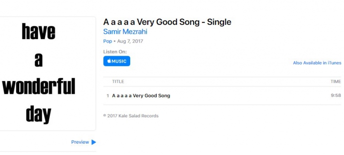 Пользователь iPhone по имени Самир Мезрахи записал 10 минут тишины и выложил беззвучный трек в iTunes. Десятиминутная песню без звука называется на первую букву алфавита: A a a a a Very Good Song — Single. Если скачать и добавить ее себе в плейлист, то каждый мучившийся до этого от прослушивания одной и той же песни при подключении, теперь насладится тишиной и будет располагать временем, чтобы выбрать нужный трек.