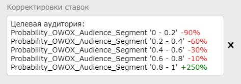 - уменьшаем ставки для аудиторий с низкой вероятностью (иногда до 90%);