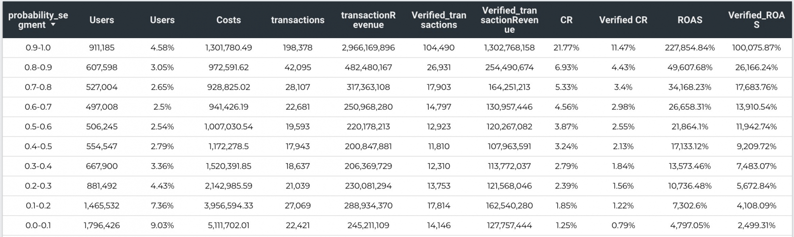 - выделили 10 сегментов пользователей, разделенных по вероятности с шагом в 10 пунктов.