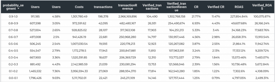 Далее все данные собираются в отдельную таблицу в Google BigQuery, чтобы видеть оценку вероятности в разрезе каждого пользователя.