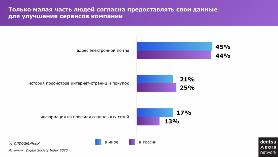 О том, что бизнес может использовать любые сведения о пользователях, чтобы улучшить свои продукты и сервисы, говорит только малая часть респондентов. При этом почти половина опрошенных (45% в мире и 44% в России) не против использования базовой информации — например, электронной почты.