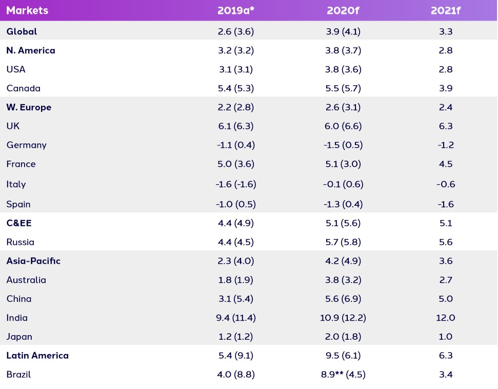На некоторых рынках прогноз темпов роста на 2020 год был пересмотрен в сторону понижения, в частности в Великобритании и Азиатско-Тихоокеанском регионе. Как ожидалось ранее, падение расходов на рекламу в 2020 году затронет Германию (-1.5%), Италию (-0.1%) и Испанию (-1.3%), что объясняется локальной политической и экономической неопределенностью. Двузначный рост рекламного рынка прогнозируется в таких странах, как Индия (+10,9%), Аргентина (+16%) и Мексика (+10,5%).