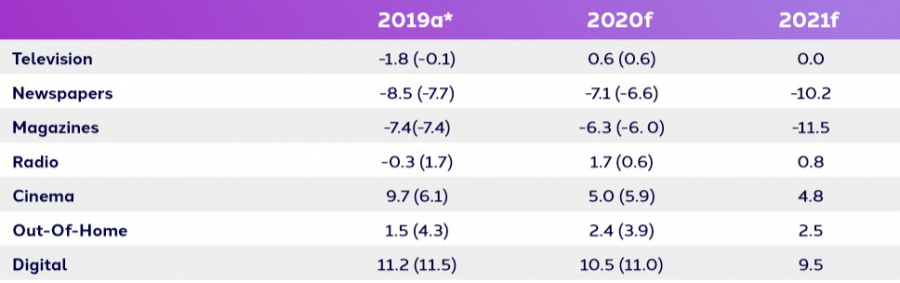 - Цифровые технологии вернут ТВ и радиорекламу к росту в 2020 году. Сохранив за собой почти треть мирового рекламного рынка (31,5%), телевидение вырастет на 0,6% в этом году. Расходы на радиорекламу увеличатся на 1,7% в 2020 году.