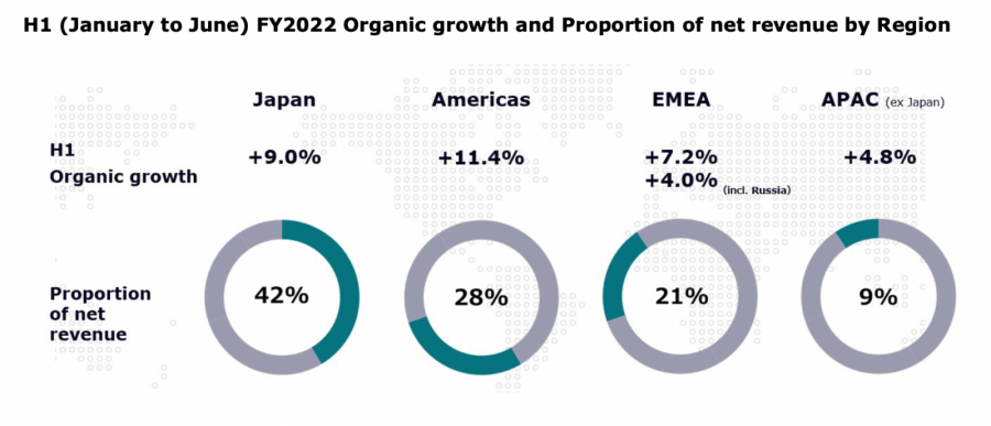 В первом полугодии 2022 финансового года чистая выручка группы (с учётом влияния России) увеличилась на 17,8% в годовом выражении и достигла 518,9 млрд японских иен ($3,9 млрд).