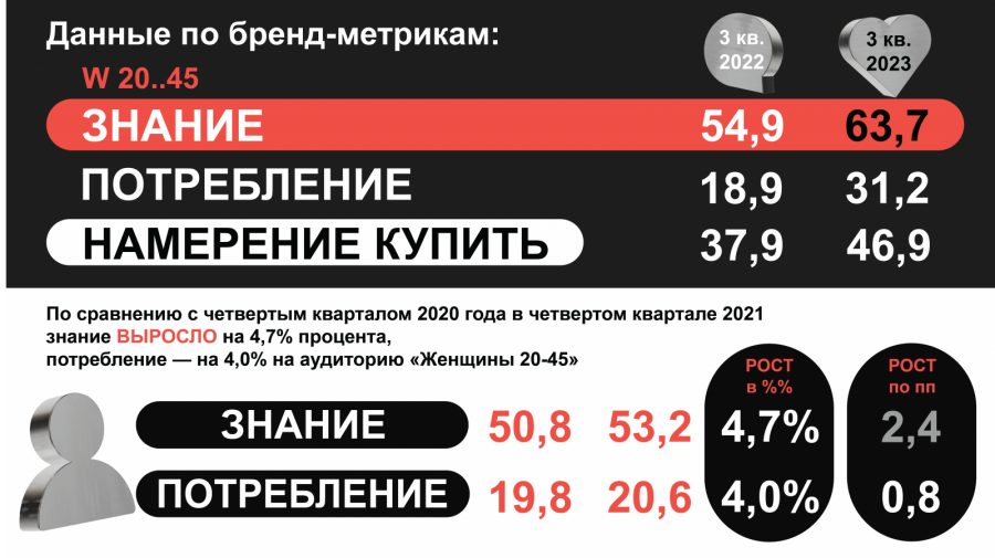 В итоге по сравнению с 3 кварталом 2023 в аналогичном периоде 2024 году мы получили следующие показатели на ту же аудиторию: знание выросло на 6,6%, потребление на 2,6%, а рассмотрение к покупке на 7,2%.
