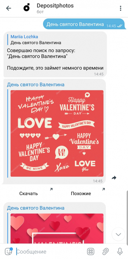 Несмотря на то, что формат не привязан к базам данных и сайтам, он имеют ряд ключевых преимуществ — не требует установки и прост в отношении интерфейса. Чат-бот Depositphotos в Telegram — это бесплатный и удобный инструмент, который помогает подобрать стоковые изображения и видео для проектов за несколько минут, а его пользователи смогут делиться находками внутри платформы или по ссылкам.