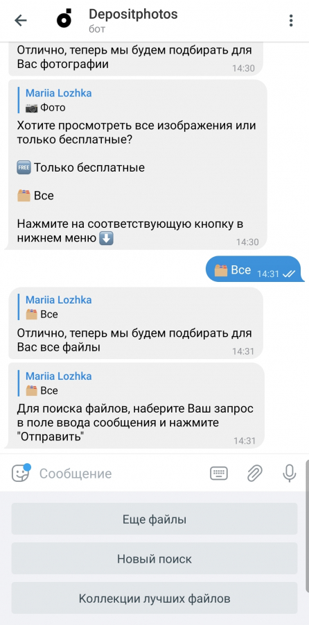 Подобно тому, как персонификация предложений для клиентов на сайте повышает вероятность первичный и повторных продаж, чат-боты помогают вам больше продавать и превосходить ожидания клиентов. К примеру, бот Depositphotos, делает мобильный поиск вижуалов простым и понятным.