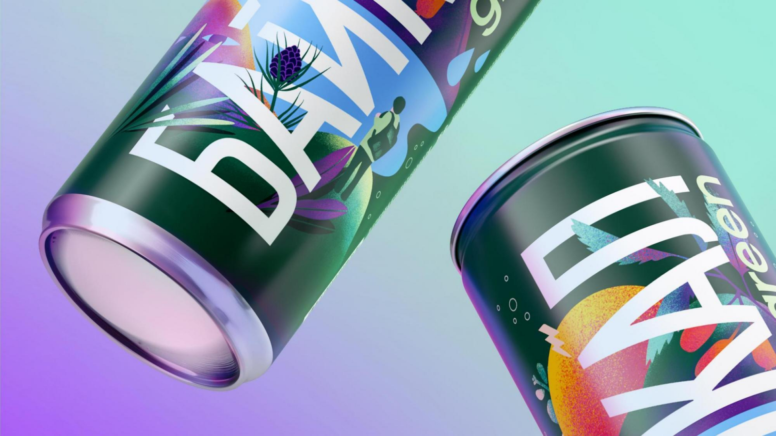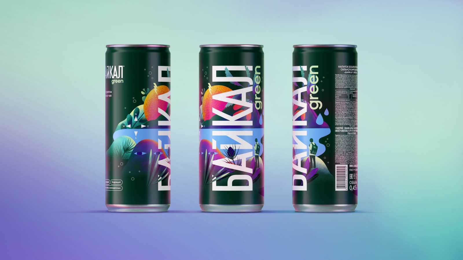 В агентстве разработали дизайн упаковки для трёх форматов — стекло, банка и ПЭТ. Продукт представлен в виде газировки (green) и энергетических напитков (natural energy) с разными вкусами.